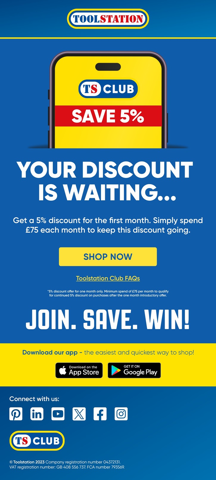 Upon completion of the first month, customers that spend £75 or more each month afterwards will continue to benefit from the 5% discount. They will also be eligible for future prize draws, product deals, discounts and competitions throughout the year once they become a Toolstation Club member.